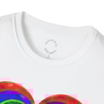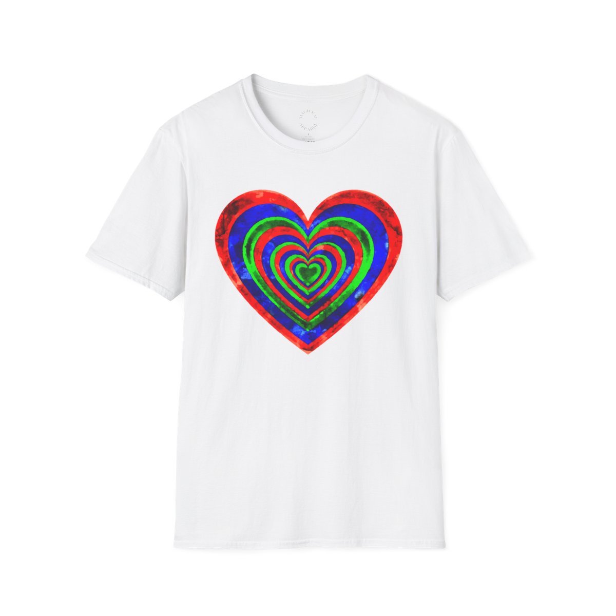 This lightweight crew-neck tee carries a hand-painted heart that feels like an open invitation — bold rings of red, cobalt, green and teal layered into a concentric, slightly imperfect heart. It sits centered on a clean white canvas so the colors pop and every brushstroke shows. Wear it when you want your mood to read loud and clear: casual walks, gallery days, or coffee with friends. The fit stays classic without clinging; the soft cotton and tear-away label keep it comfortable for long afternoons. It’s an easy way to bring color and warmth into everyday life and to speak a little louder without saying a word.